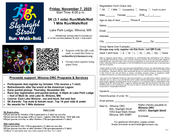 This is a 1 mile 5 K event for all ages and abilities.  It is at dusk so bring your glow and volunteer or participate in this Winona ORC fundraiser. All ages and abilities are welcomed- it is a run, walk, or roll event. We have some volunteer needs during the event, help with racer bags a few days before, set up and bag pick up day of, and MOST of all recruitment of participants.  If it is allowed- I am happy to give volunteer hours for recruiting and helping get people signed up.  Please post on your socials.  Feel free to repost our fb post.