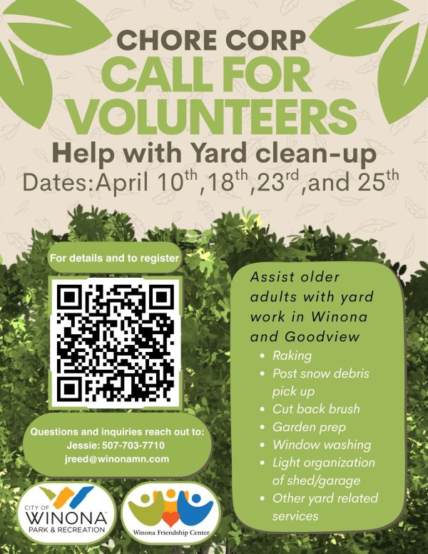 Volunteers will assist people ages 60 and up with yard work to prepare for the change of seasons in the City of Winona and Goodview. Equipment is provided. Volunteers will assist with raking, weeding, cutting back gardens and brush, window washing and other yard related helps.